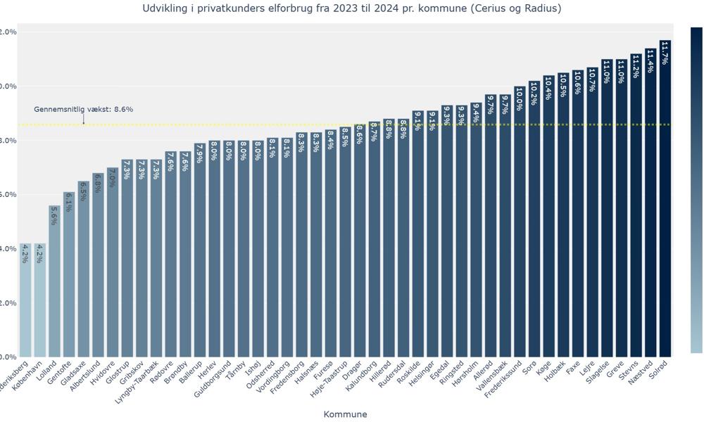Elforbruget i de tre kommuner steg med over 11 pct. fra 2023 til 2024. Den gennemsnitlige vækst i samtlige kommuner i de to netselskabers dækningsområde var på 8,6 pct.